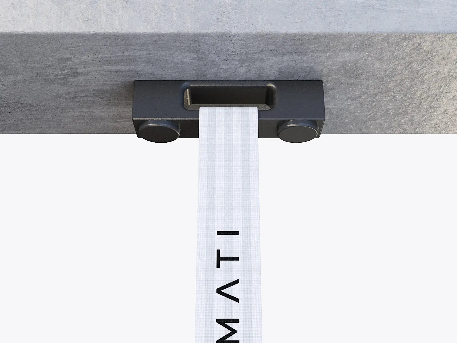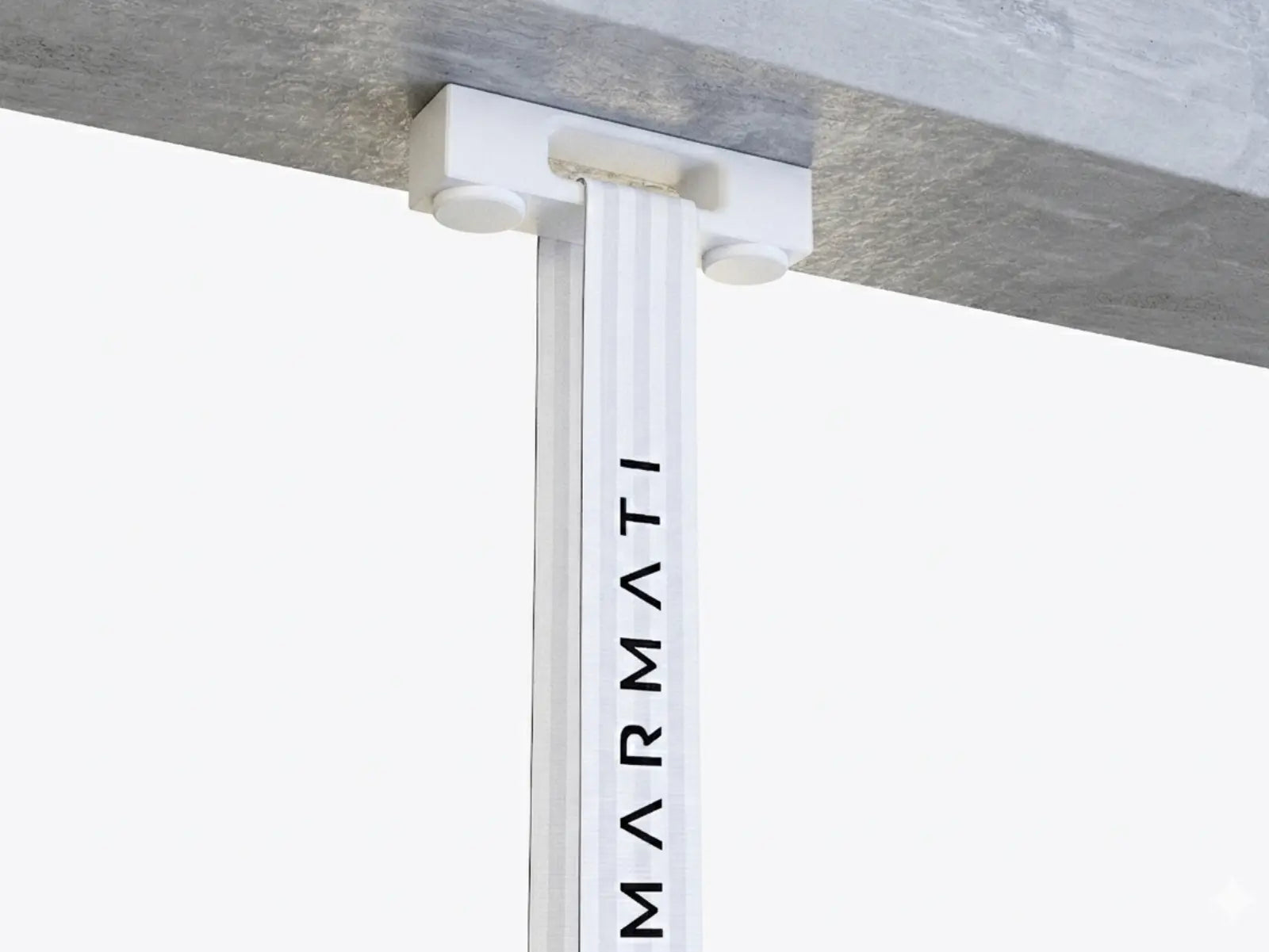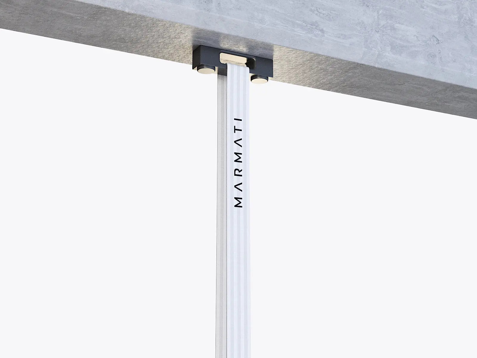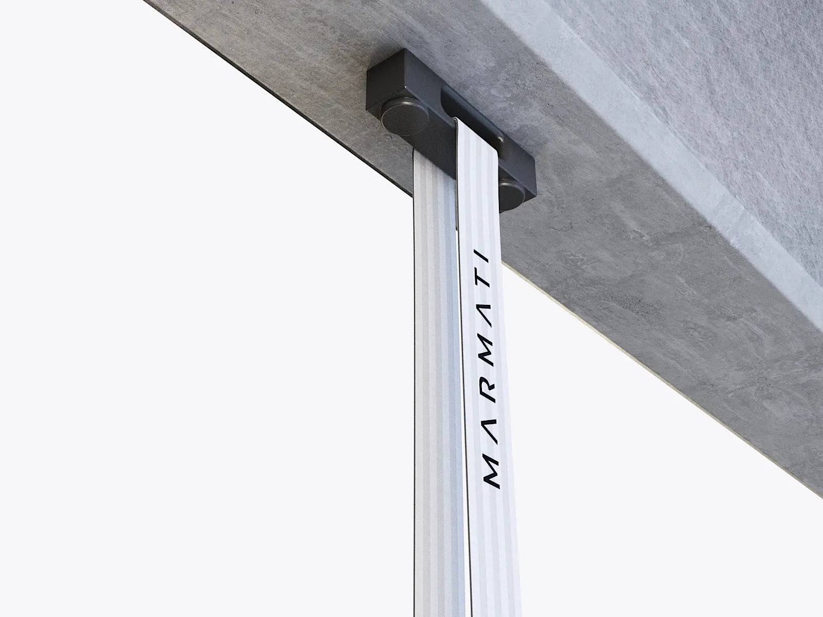 Close-up of a metal ceiling mount attached to a concrete surface with Marmati branding. #color_black