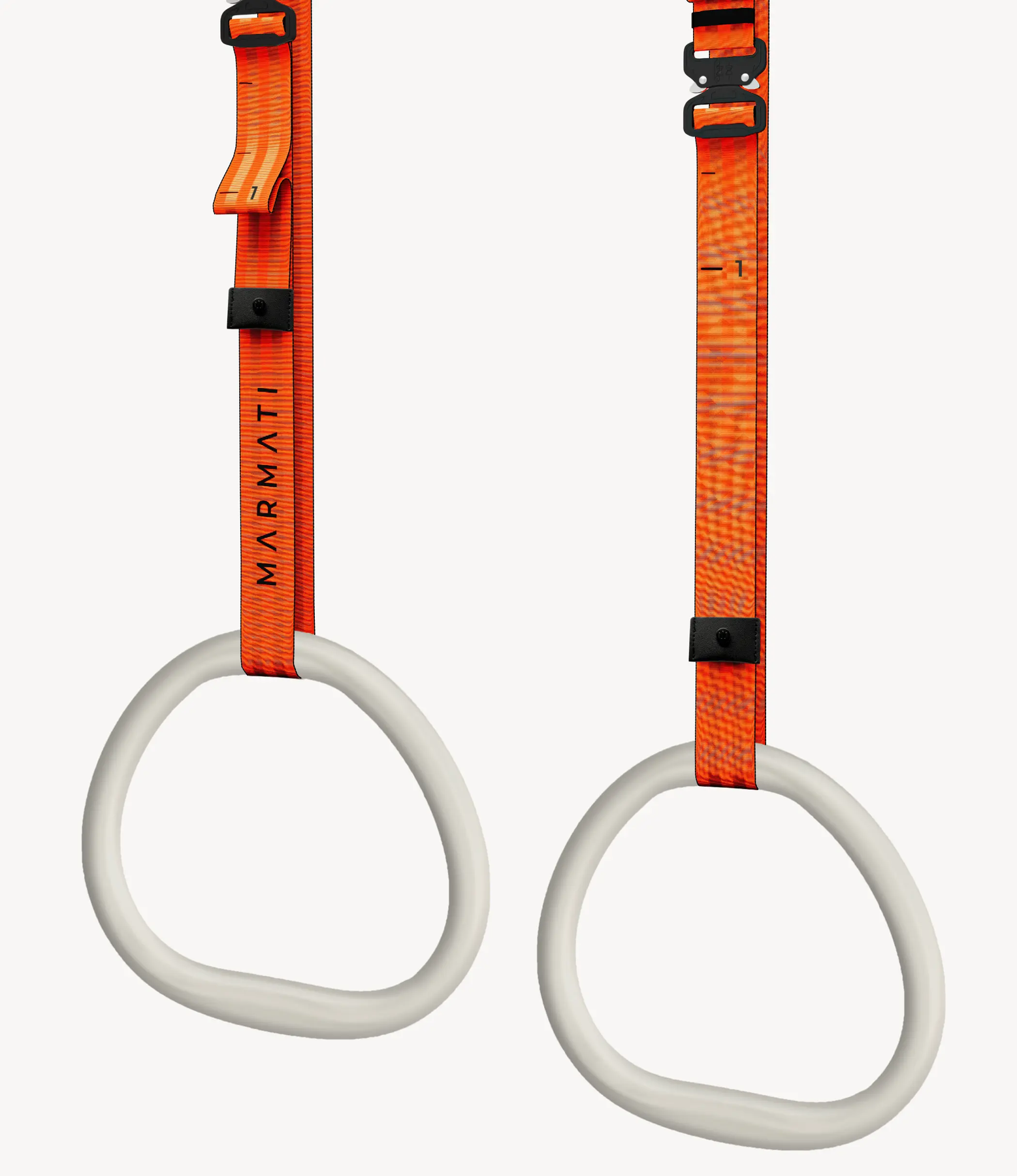 Ergonomic gymnastic rings with aluminum handles for superior grip and comfort. Adjustable straps for fitness, gymnastics, and crossfit training exercises in orange colour of the recycled straps.